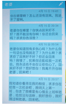 于是这个外表粗犷的男人开始尝试写情书,连日来,他撰写了百余条情意绵绵的短信,但并未挽回女友的心,于是忐忑不安地联系记者,希望女友能明白他的悔意:“姜兰(系傅先生对她的昵称),你快点回来吧,我错了。”