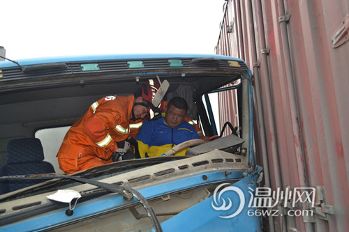 温州网4月22日讯(记者 潘涌燚 通讯员 王勤剑 胡利淮)4月22日上午,瑞安大桥接线路段,一辆载有10吨液碱的槽罐车与大货车发生相撞。事故导致一人被困,所幸经过当地消防官兵的紧急救援,被困人员被安全救出。目前具体事故原因正在进一步调查中。