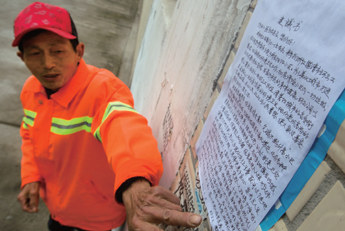 乐清市旭阳小区几栋楼房外墙上,贴有一份手写的《建议书》,在3月底贴出,落款是“环卫工朱雪保”。