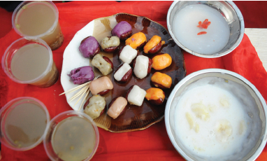 做法:将食材蒸熟后打成泥,和上糯米粉,填入红枣中再蒸。蘸酱也很好做,将甜牛奶与切成小块的香蕉一起煮开,然后加入水、淀粉勾芡即可;糖水是用冰糖放入水中煮开,然后勾芡。