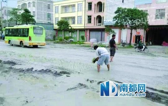 今年清明节期间,合浦连续下大暴雨,路段积水,过往车辆碾轧使路面形成泥浆,通行非常困难,群众意见很大。为了引起社会的关注,村民在国道上插秧,并打出了“为了不浪费土地,公路变农田”的标语。记者从村民处了解到,当时现场足有约两分地的秧苗已开始生长,当地居民称为“史上最牛国道”。