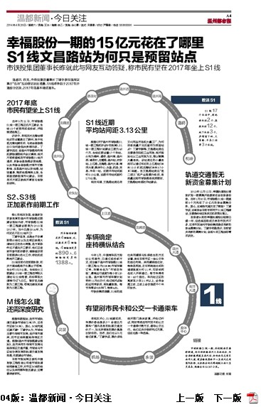 2012年12月12日,幸福轨道股份增资扩股一期募集开始接受社会投资者投资。去年1月30日,市域铁路S1线一期提前3个月完成了15亿元的资金募集任务。那么,这笔钱究竟花在了哪里?丁建宇说,这笔资金目前专项用于S1线工程建设,主要是沿线征地拆迁和政策处理上。
