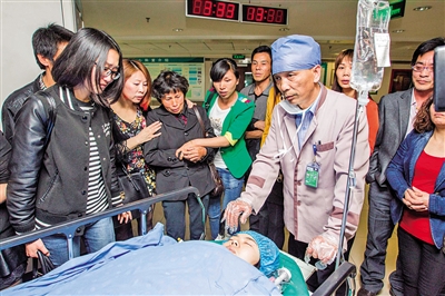 图为陈月静躺在手推床上出现在大家面前。赵用摄
