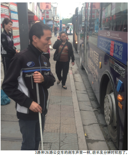 “我几乎每周都会出去活动几次,参加各种讲座和盲人联谊活动。每次出门都是乘坐公交车,但3路、26路都是油电混合型公交车,刹车声音一样,就无法分辩。”这让胡长友犯愁。