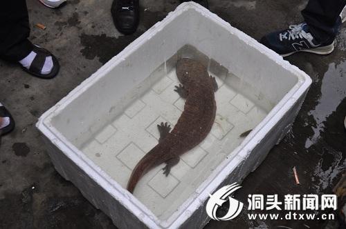 温州网洞头支站讯 今天早上六点多,温州洞头市民叶宋目在隔头村的凸垄底水库捕获疑似娃娃鱼的两栖动物。海洋渔业局等相关部门随即赶往现场进行确定。