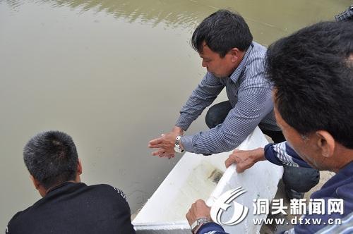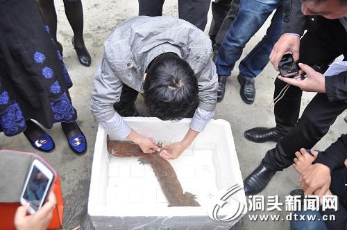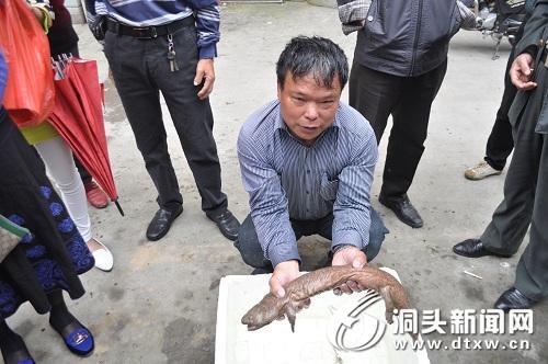 温州洞头市民叶宋目在隔头村的凸垄底水库捕获疑似娃娃鱼的两栖动物。海洋渔业局等相关部门随即赶往现场进行确定。