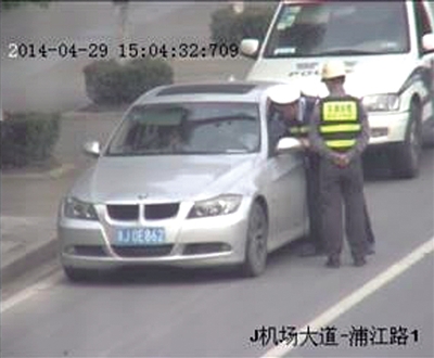 午后的机场大道浦江路口车来车往。一个红灯期间,他发现路口有辆浙J牌照的银灰色宝马轿车涉嫌违章,就上前例行检查,要求司机出示驾驶证、行驶证。
