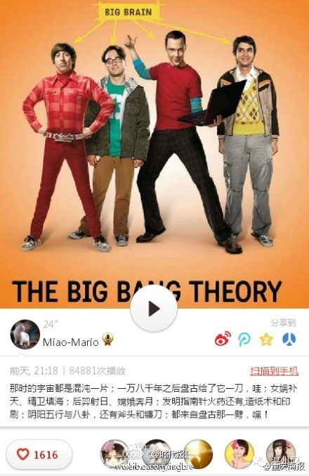 冷风中,鸟儿唱起来了生活大爆炸中文主题曲:那时的宇宙都是混沌一片;一万八千年之后盘古给了它一刀,哇;女娲补天、精卫填海;后羿射日、嫦娥奔月;发明指南针火药还有,造纸术和印刷;阴阳五行与八卦,还有斧头和镰刀;都来自盘古那一劈,嘿!