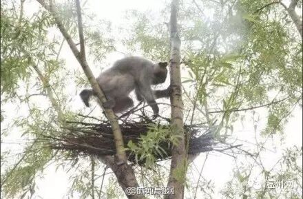 战士一个哨音,猕猴就左右手同时开工,将鸟窝底部一支支小树枝抽出来,没几分钟,鸟窝已摇摇欲坠…高空作业,特殊工种。