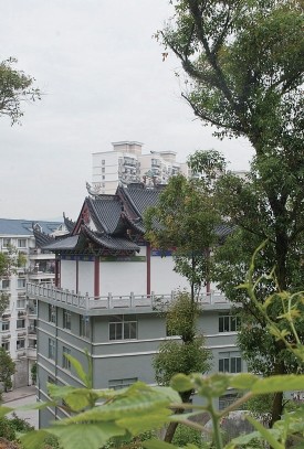 这处建筑位于北白象镇西漳社区樟湾村西首,一共四层。背靠着当地的樟湾山,在一片绿色的大山背景掩映下,远远看去,四层楼上加盖一个祠堂的特殊“混搭”,令整幢房子显得特别抢眼。通往这里的道路有18米宽,两边林立着多幢如今名为“樟湾新村”的现代商住房。