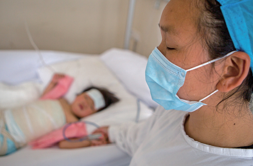 该院重病监护室医生杨梅介绍,妍妍转到该院时,她的躯干至小腿处为二度与三度烫伤,占到全身皮肤面积的50%,另外从肺里吸出了20来毫升饭、菜等,病情危重。“在重病监护室的三天里,小女孩脸是浮肿的,眼睛都睁不开。”