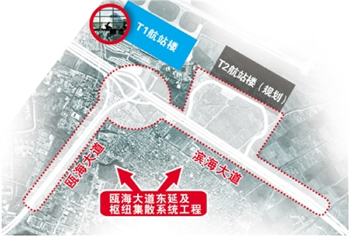瓯海大道东延及枢纽集散系统工程为市重点工程,是市委市政府重点实施的五条城市主干道之一。该工程位于龙湾机场西侧,工程范围包括瓯海大道及滨海大道,其中瓯海大道东延的部分(与机场大道部分重合)的施工范围为永强大道至龙湾国际机场,长1.47公里,工程内容还包括滨海大道与瓯海大道互通立交以及与规划T2航站区机场高架的连接工程。