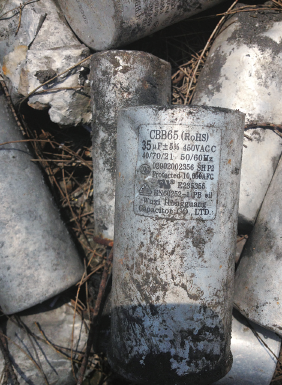 记者在现场看到,六处原来非法炼铝点的场地,目前铝末、粉尘遍地,地面和周边树上依然看上去被裹上了“银装”。有一处非法炼铝点的简易棚、炉灶只是被部分拆除,砖墙和木架没有被完全推倒,旁边还有两大堆“空调专用”废铝电容器、外包装写着“无磷处理粉”、“工业用氢氧化钠”的黄色固体等。还有,由非法炼铝点遗留的污染物与雨水混合而成的污水流进了一旁的塘河。