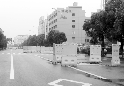 在温州大道上江路至汤家桥南路段、玉苍西路、雁荡西路、括苍西路一带,这样的黄色围栏也是随处可见。在上下班高峰时段人流较多的温州大道上,记者看到原本四车道的道路,被黄色围栏占据后,最窄处只剩下了1个半车道。车辆行至此处,时不时要踩下刹车,缓慢前进,此时,后面车辆的喇叭声不绝于耳,噪声一片。