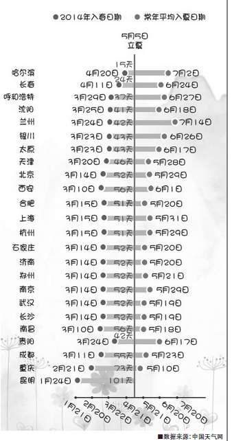 以杭州为例。杭州今年入春时间为3月15日,每年入夏的时间不太一致。如前年5月17日就入夏了,而去年拖到了6月6日。最近60年来,入夏最早一年是2009年5月5日,最晚是1969年6月11日。按照一般在5月29日左右入夏时间来算,如果今年表现正常的话,那么这个春天可能有75天。截至今天,杭州的春天大概只有10天左右的光景。