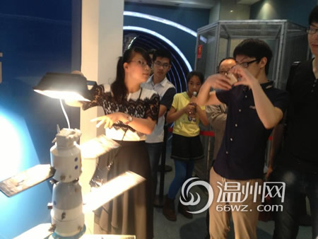 网友现场观看神州飞船模型,讲解员用灯光模拟太阳,照射模型上的太阳能电磁板,原理是光能转换为电能。这样飞船就能在太空正常工作了。
