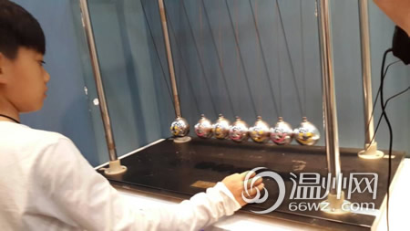 小朋友体验弹性碰撞,感受能量守恒的奇妙。根据能量守恒原理,用一只小球去撞击,通过能量的传递,最后一只小球便会被弹起,用两只小球去撞击,另一边便会有两只小球被弹起。