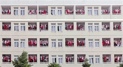 阴雨天,大学宿舍楼里晾满了晒不干的衣物。苏巧将摄