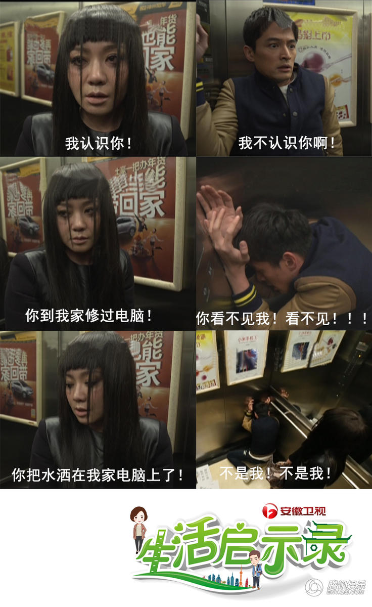 由安徽广播电视台全资定制的电视剧《生活启示录》即将于5月22日在安徽卫视正式开播。今日,一组闫妮在剧中鬼魅造型吓坏胡歌(微博)(微信号:huge_weixin)的剧照曝光。从剧照中可以看到闫妮发型神似“贞子”,流下两行“黑泪”,表情僵硬呆滞,吓傻了一向以潇洒形象示人的男神胡歌。而闫妮之所以被胡歌当成“贞子”,是因为闫妮在遭遇了巨大的打击后在电梯偶遇了外出归来的胡歌,从而发生了男神被“女神经”吓傻这一戏剧化的一幕。