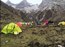 艰难爬行海拔4050米的1号垭口时,艳阳高照的天空竟然飘起了漫天雪花。大伙便提前收队,在海拔3900米的地方找了一处空旷的草地安营扎寨。“蚂蚁”、“坷垃”、“绿叶”等驴友开始寻找石块、木材,搭锅做饭。