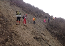 到处是陡坡、雪地、岩块、碎石,没有现成可行的路,大多时候,驴友们拄着登山杖,行走在丹霞地表形成的山体横切路段上,坡高、路面窄,并且布满风化脱落的小卵石,脚踩上去非常滑,尤其是一些积雪的路段,稍有不慎就可能发生意外。