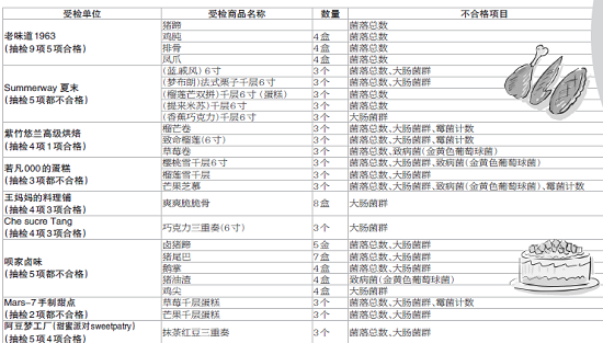 其中,“紫竹悠兰高级烘焙”送检的4个批次产品中有3个批次不合格,“老味道1963”抽检的8个批次产品中半数为不合格,“若凡000的蛋糕”抽检3个批次产品和“Mars-7手制甜点”抽检的两款自制蛋糕均不合格,“Summerway夏末”、“呗家卤味”两家抽检的各5个批次的产品均不合格,Che sucre Tang抽检的3个批次产品有1个批次不合格。