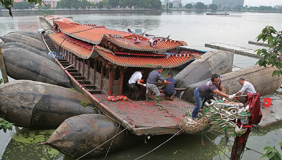 据介绍,根据之前的初步方案,水上台阁沉没后,将采用吊车起吊。最后没有采用这个方案,是因为台阁沉入水里的时间较长,台阁里面的淤泥多,贸然用吊车起吊,很可能导致台阁整体散架。为了防止这一情况的发生,决定还是用去年的气囊打捞方法。