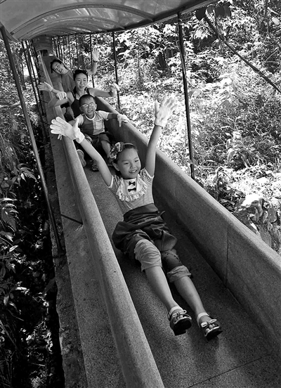 游客在我市首条森林健身滑道体验速度,领略两旁向后掠过的风景。 赵用 摄