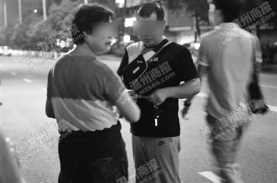 市区人民路移动大楼附近,这名非法收费者(右一)在下午5点多时看到行动组过来,就悄悄躲起来了。晚上8点半,记者和行动组回访时发现他又出动了。