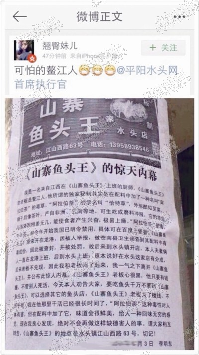 传单称:“山寨鱼头王”的配料加了一种名为“阿拉伯茶”的毒草,这种物质对人体有害,但在配料里加了它,味道会很鲜美,给人一种回味无穷的感觉。传单内容还显示,这名“厨师”和妻子之前在苍南龙港上班,因“山寨鱼头王”老板承诺分成,来到了“山寨鱼头王”平阳水头店。因老板未兑现承诺,他与老板发生矛盾并离开了该店,决定曝出内幕。