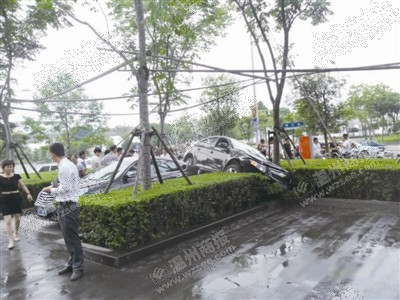 记者昨日下午在现场看到,从石阶处到被撞车子停放的地方差不多有十多米距离,绿化带上方的灌木丛叶子也都被车底“削平”了,“不知道的人还以为是人为修剪过的呢。”附近一位保洁员介绍。