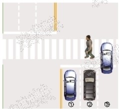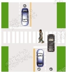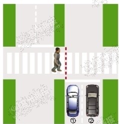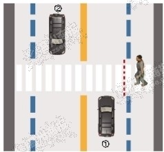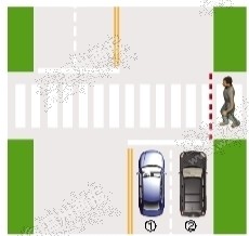 当行人未跨越绿化带虚拟延长线时,①车道的机动车需停车让行;当行人跨越绿化带虚拟延长线,①、②车道的机动车需停车让行。