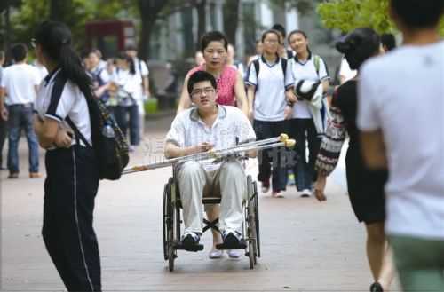 昨天中午,温州中学考点,任同学因为腿部受伤,由母亲推出考场。