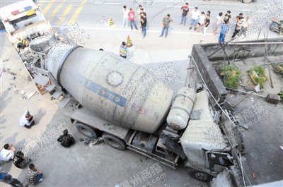 昨天下午,记者赶到现场时,交警正组织拖车对撞入民房的水泥搅拌车进行拖离。记者看到,水泥搅拌车车头深陷民房,车身下满是被撞摩托车的碎片和油污,而车轮下还有一辆儿童推车的残骸。