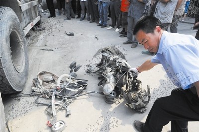 从水泥搅拌车底拉出来的手推车和摩托车残骸。 金鱼 摄