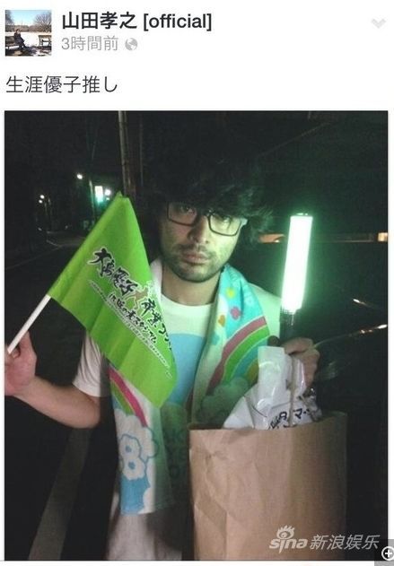山田孝之称:“我去看了AKB48大岛优子毕业LIVE!”并附上自己身穿带有AKB标志T恤的照片,照片中他还手持写着“大岛优子推”的应援牌。