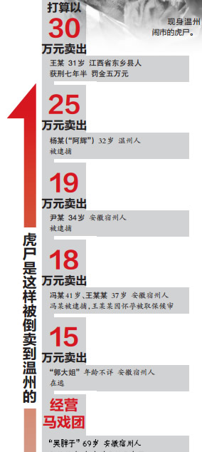 1月8日上午,王某在温州市区江滨路交易虎尸时,被路过的特警抓获。经鉴定,这是只东北虎的尸体,东北虎属于国家一级保护动物。3月4日,温州卖家杨某(阿辉)被鹿城警方抓获。4月3日,温州买家王某因非法收购珍贵、濒危野生动物罪获刑。