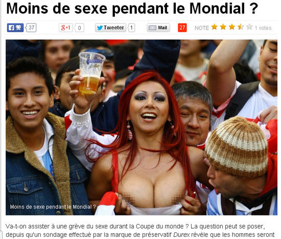 不过,也有42%的受访男人表示他们还是会按照往常一样的频率过性生活,但是也明确表示在世界杯期间性爱持续时间将会比平时更快,以便自己能尽快的重新回到观看比赛的过程当中。因此,SoFoot的文章最后直接用了一句“足球抹杀性爱”来对世界杯期间男人性爱行为会减少的原因进行了总结。