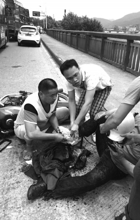 温州网讯 昨天上午,温州市瓯海天长岭隧道附近发生一起车祸,一辆拖拉机与一辆摩托车发生刮擦,摩托车驾驶员受伤躺在路边。一名医生途经事发点,发现伤者后立马出手实施院前急救,纠正错误包扎,防止伤势进一步恶化。