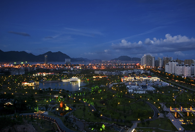 有山、有水、有树、有桥、有亭……加上灯光的衬托,让这月色下的杨府山公园显得更加美不胜收。晚上来这儿纳凉的人都是住在附近的居民,带着孩子来的居多,吃完饭后,到公园里散个小步或快走一段再合适不过。嬉嬉闹闹,走走停停,抬头看看放在半空中的夜光风筝,倒也不失乐趣。公园里有专门的步道,拾阶而上,到了山顶,人就少一些了,那半城的景色可以尽收眼底。