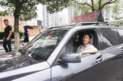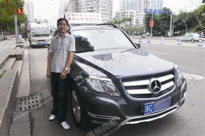 林宝坤开着奔驰车顶着广告牌上路引来路人驻足观看。徐晓春 摄