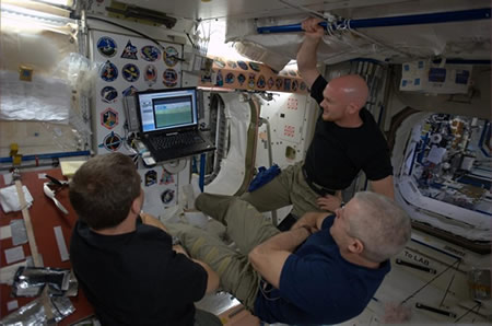 巴西世界杯目前正如火如荼的进行中,足球的魅力不仅席卷了全球,甚至冲出了全球走进了宇宙。近日在地球之外的国际空间站中,三位宇航员在工作间隙通过网络观看了10分钟的世界杯比赛直播。