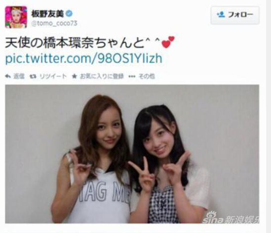 原AKB48板野友美6月15号更新推特,贴出她与福冈偶像组合Rev. from DVL人气成员桥本环奈的合影