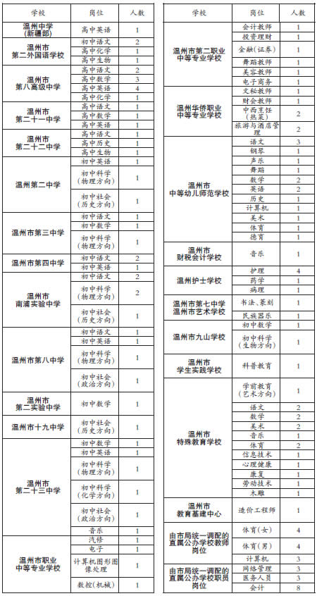温州市教育局发布公告,面向师范类毕业生和社会其他人员,公开招聘直属学校全额事业编制专业教师和工作人员131名、直属民办学校事业人事代理教师28名。