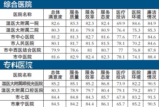 参加调查的医院包括温医大附一院、温医大附二院、市中心医院、市人民医院、市中西医结合医院、市中医院、温医大附属眼视光医院、温医大附属口腔医院、市七医、市康宁医院10家医疗单位。其中,温医大附一院在综合医院中总体满意度(包括门诊和出院患者)最高,百分制中达到82.6分;温医大附属眼视光医院达到85.2分。