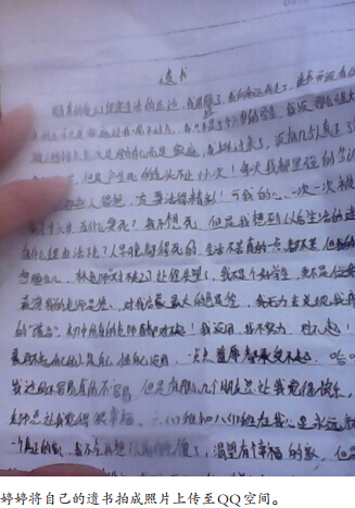 婷婷生前曾把QQ密码告诉杉杉。昨天,杉杉登录婷婷的QQ,向记者展示了婷婷留下的遗书。这是一封用水笔写在稿纸上的遗书,婷婷将它拍下上传到相册内。这份遗书的实体,婷婷的父母没能找到。