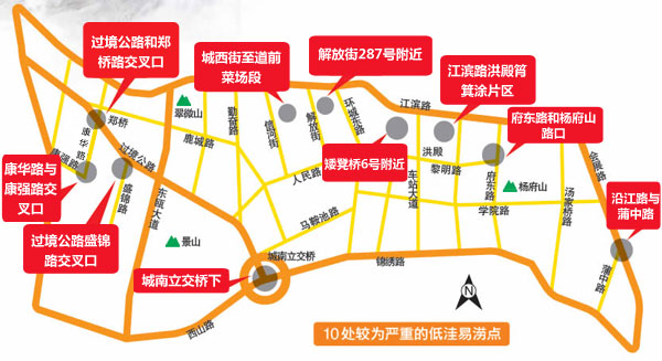1、木材市场边道路;2、新宫横巷;3、鹿城后巷31弄;4、鹿城后巷85弄;5、珍宝舫对面巷口;6、康华路与康强路交叉口;7、锦绣路公园前;8、泰力路与富士达路交叉口;9、新城站广场外;10、学院路金丰园路口;11、民航路蒲鞋市片区;12、江滨路洪殿筲箕涂片区;13、城街片区(城西街至道前菜场段) ;14、西城路片区(菜场边) ;15、府东路和杨府山路口;16、矮凳桥6号附近;17、矮凳桥与东明路交叉口;18、江滨中路黎明侨村4栋;19、纱帽河62号附近;20、公园路温州日报报业集团附近;21、广场路和城西街;22、墨池坊15号附近;23、解放街铁井栏61号附近;24、解放街287号附近;25、解放街晏公殿巷10号附近;26、解放街瓦市巷123号附近;27、望江路麻行出水口;28、望江路与信河街口水闸;29、望江东路4号对面大榕树下水口;30、过境公路盛锦路交叉口白楼4栋附近;31、过境公路和郑桥路交叉口;32、市政管理处黄龙泵站;33、鹿城路原黄龙客运中心入口;34、城南立交桥下;35、勤奋路金鹏宾馆附近;36、望江路麻行水泵站附近