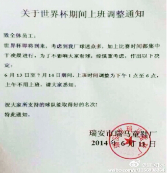 “几天前,我看见朋友发的一条微博,上面有一张照片,内容是他的公司关于世界杯期间上班调整的通知:世界杯即将到来,考虑到厂里球迷众多,加上比赛时间都集中于凌晨进行,为了不影响大家看球,在世界杯期间,上班时间调整为下午1点至6点,上午不用上班。” @加冰开水说,