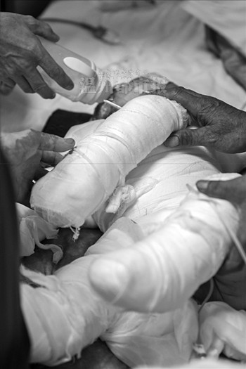 记者昨天上午第一眼看到他时,心瞬间就揪紧了:他的身上插了好几条管子,四肢和躯干被白色的纱布裹得严严实实,头上也用绷带缠着,小嘴黑红。