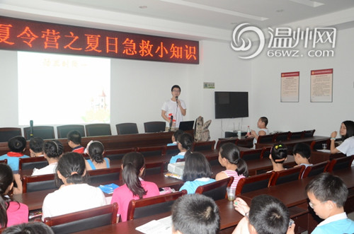“小老师”也尽职尽责,通过讲解游泳意外的案例,播放急救方法视频,示范外伤处理和简单包扎的手法等方式教授了孩子们如何保护自身安全,减少意外事故对自身的伤害。“小老师”是温州医科大学中医专业的大三学生陈峥,他结合自身所学,带领孩子们操练了太阳穴,人中,合谷等急救穴位的使用方法,充分发挥了中医在日常生活中实用的一面。